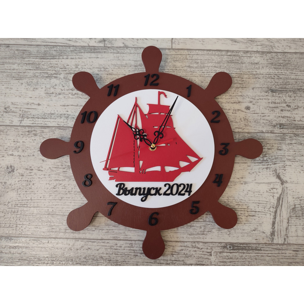 Часы "Алые паруса" в подарок учителю на выпускной. Часы имеют форму штурвала, а по центру накладной парусник и надпись.