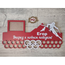 Спортивная медальница для лыжника с надписью "Вперед к новым победам", фоторамкой, именем и кольцами для медал..