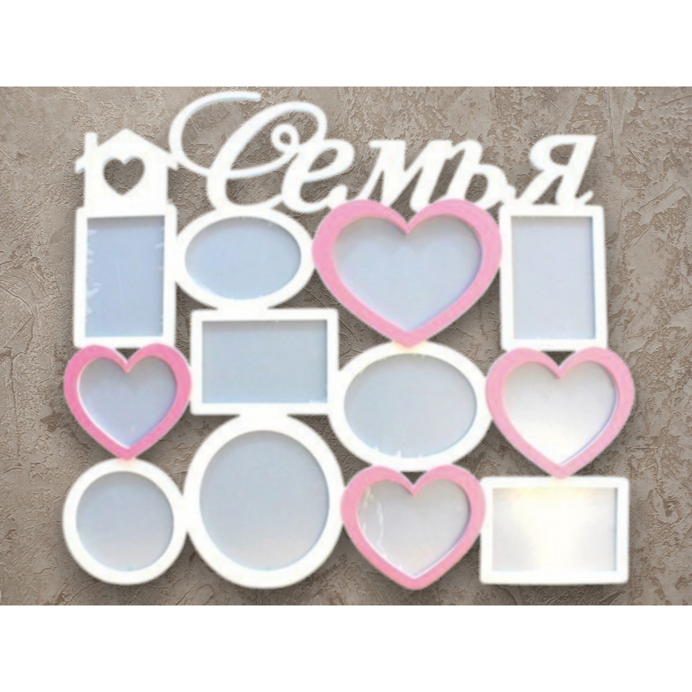 Фоторамка на 12 фото разных форм и размеров с домиком и словом Семья сверху.