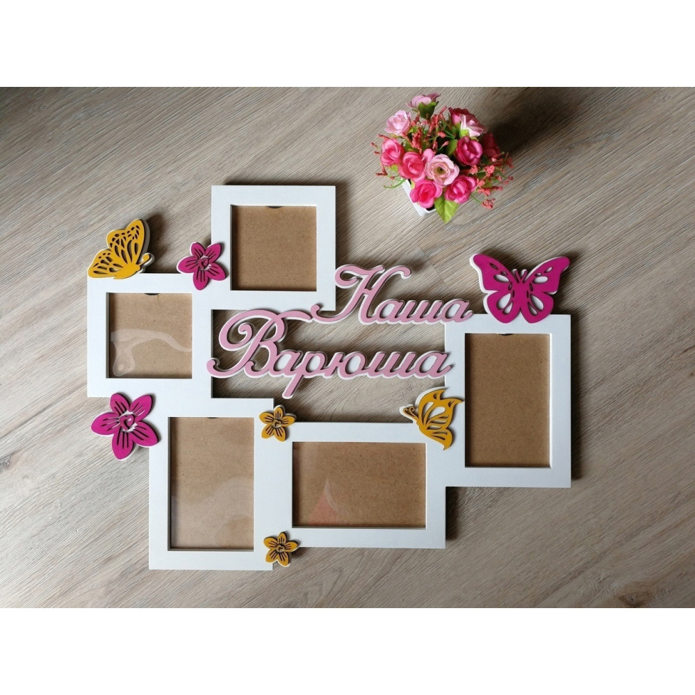 Фоторамка на 2 фото 10х10см и 3 фото 10х15см с именной надписью и бабочками с цветами.