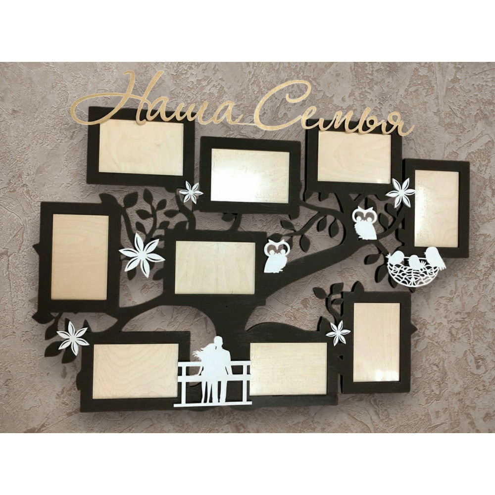 Фоторамка на 9 фото 10х15см с надписью "Наша семья", совами, птенцами в гнезде, цветочками и влюбленной парой на лавочке.