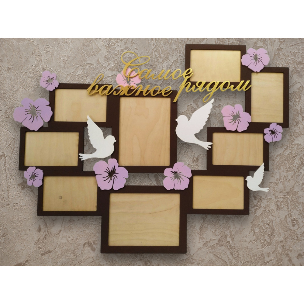 Большая фоторамка для 7 фото 10х15см и 2х 15х20см. Имеет надпись "Самое важное рядом" и изображения голубей и цветов.