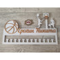 Медальница имеет полку для кубков и вешалки для медалей. Центральные кольца и фамилия с именем покрашены..