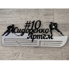 По краям медальницы расположены фигурки хоккеистов, а по центру фамилия, имя и номер игрока...