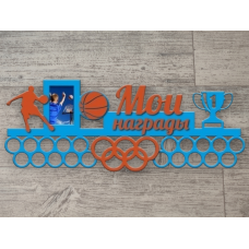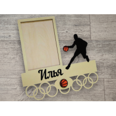 Медальница имеет фоторамку размером 15х20см, баскетболиста с мячом и кольца для медалей, а центре которых накл..