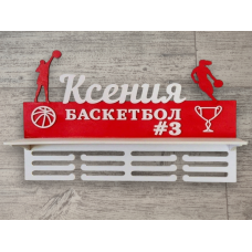На основании медальницы расположены баскетбольный мяч, слово "Баскетбол" с номером и кубок, а сверху имя и две..