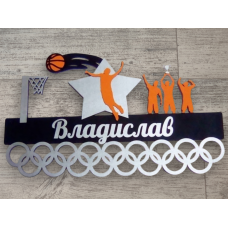 Сверху данной медальницы расположены 2 фоторамки 10х15см, 2 фигурки баскетболистов, и имя. Чуть ниже надпись "..