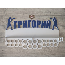 Сверху медальницы расположена фигурка боксера в шлеме, на основании слово "BOXING" и имя, а снизу вешалки для ..