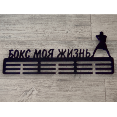 Медальница покрашена в черный цвет и имеет надпись "Бокс моя жизнь", фигурку боксера и палочки для медалей...