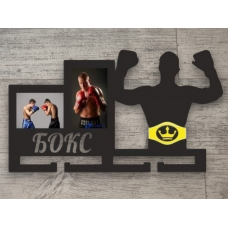 Медальница имеет 2 фоторамки 10х15см, под которыми вырезано слово "Бокс", а справа фигурку боксера с поясом...