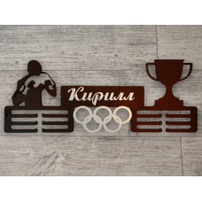 Слева и справа медальницы находятся, боксер, кубок и палочки для медалей, а по центру имя и кольца для медалей..