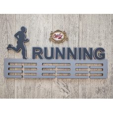 Медальница покрашена в темный и светлый серый цвет и имеет надпись "RUNNING", фигурку бегуна и палочки для мед..
