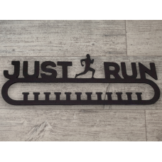 Медальница имеет сверху фигурку бегуна и надпись "Born to run". На основании олимпийские кольца. А так же меда..