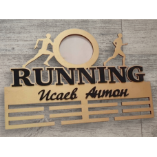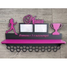 Сверху медальницы находятся бегуны и круглая фоторамка, по центру надписи, а снизу вешалки для медалей...
