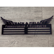 Медальница по краям имеет изображение крыльев и надпись, а в основании вырезаны фамилия с именем и бегун...