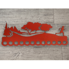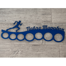 Медальница покрашена в синий цвет и имеет 1 ряд колец для медалей, фигурка бегуна и фамилия с именем...