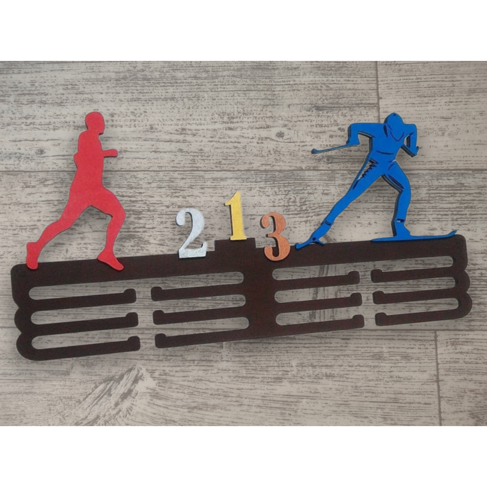 Медальница имеет по краям фигурки бегуна и лыжника, а по центру цифры 1,2 и 3.