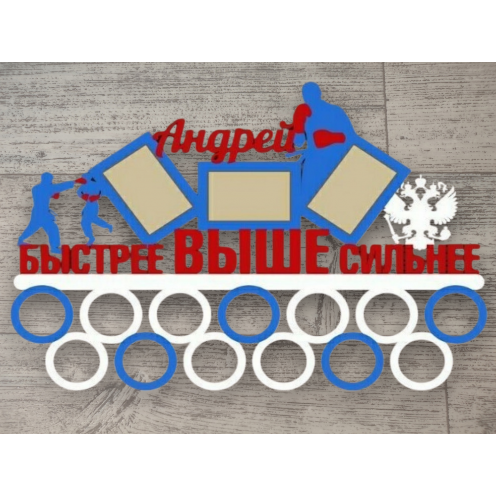 Медальница имеет 3 фоторамки, фигурки боксеров, герб России, надпись "Быстрее Выше Сильнее" и кольца для медалей. Покрашена медальница в цвета флага РФ.