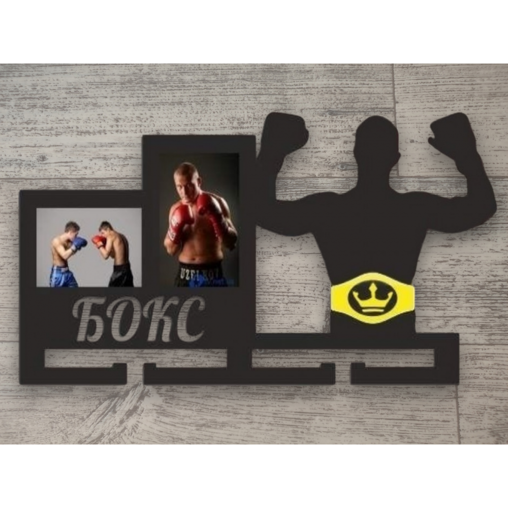 Медальница имеет 2 фоторамки 10х15см, под которыми вырезано слово "Бокс", а справа фигурку боксера с поясом.