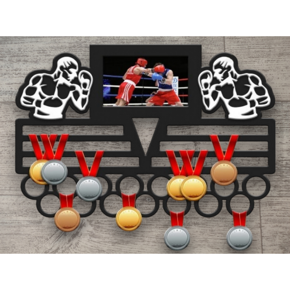 Данная медальница оригинальна тем, что у нее и круглые и квадратные держатели для медалей. Сверху расположены 2 силуэта боксеров по сторонам фоторамки.