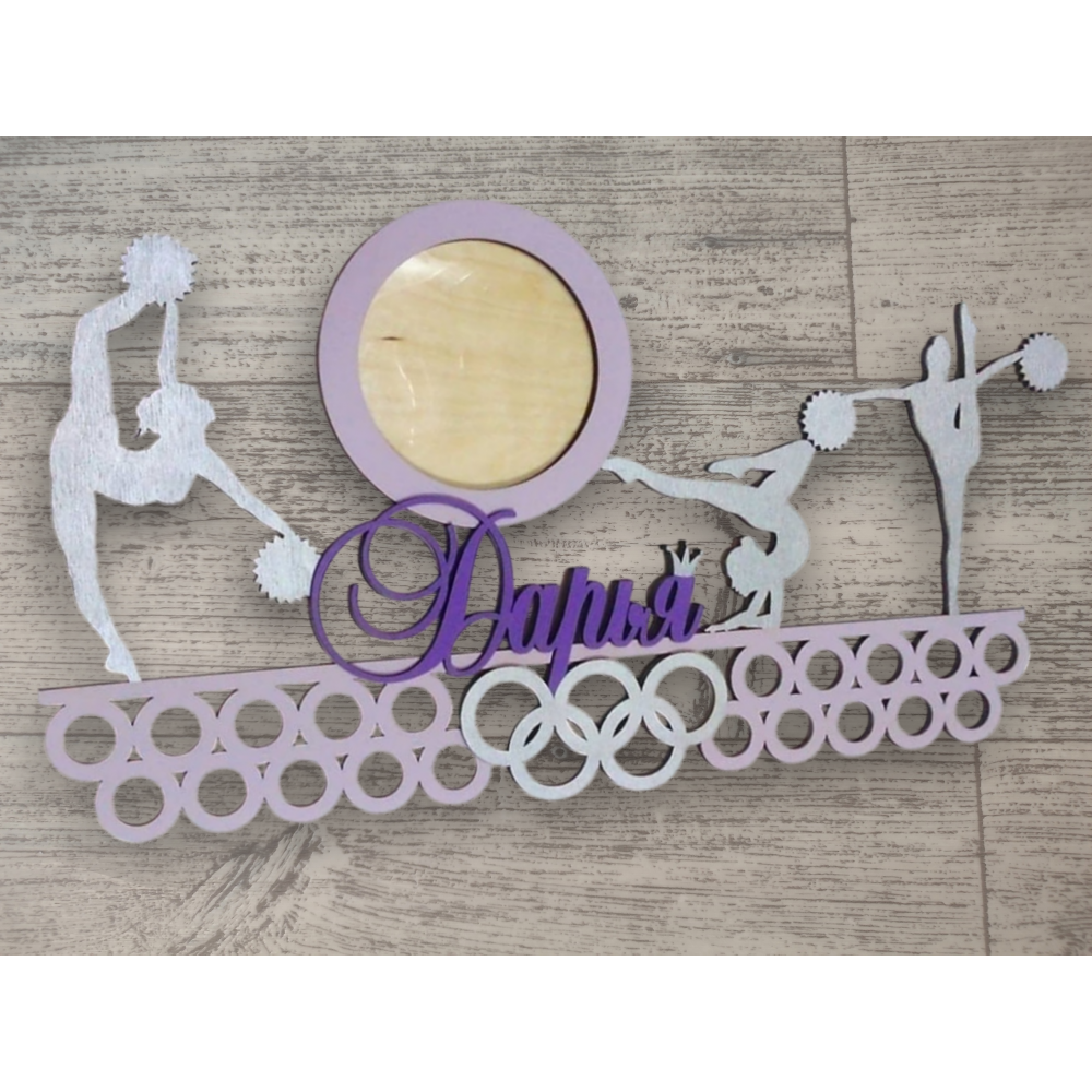 Медальница состоит из 3х фигурок, круглой фоторамки 10см в диаметре, имени и вешалок для медалей в форме колец.