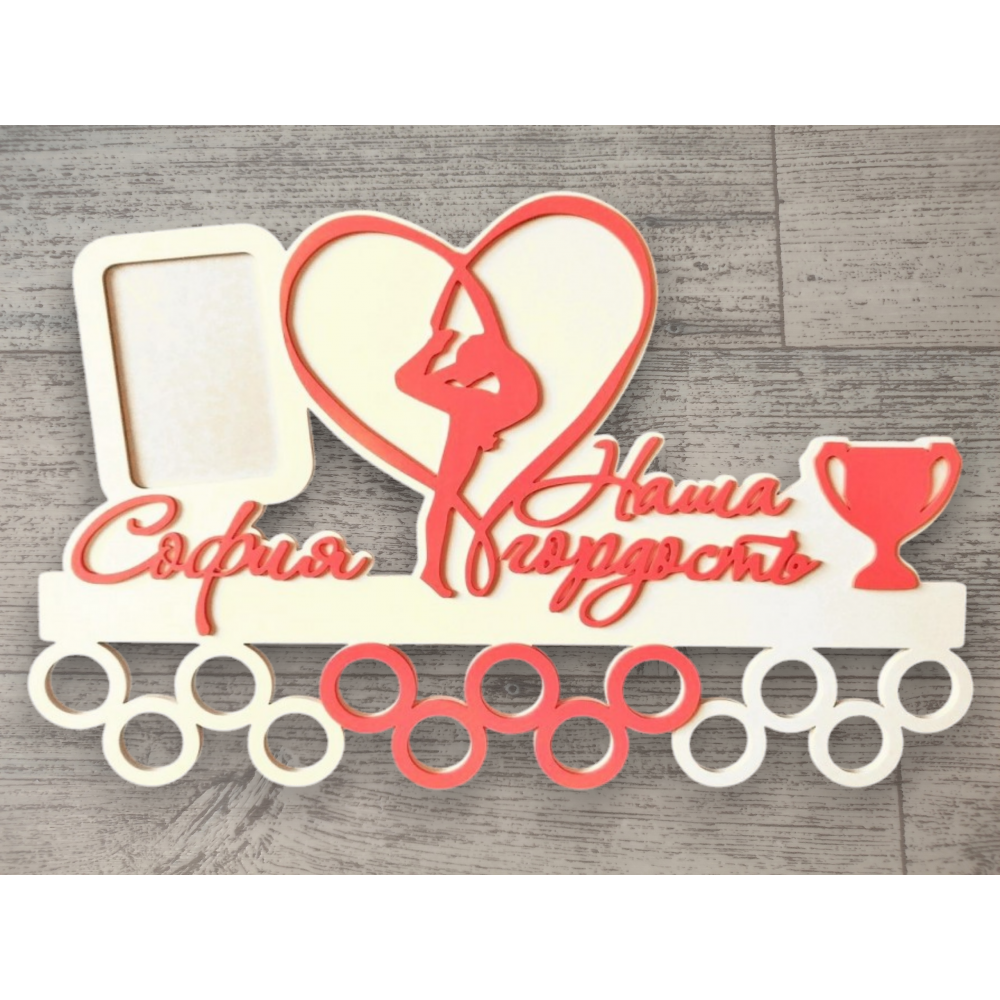 Медальница имеет немного нагнутую фоторамку 10х15см , имя, надпись "Наша гордость", фигурку гимнастки с лентой, кубок и колечки для медалей.