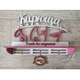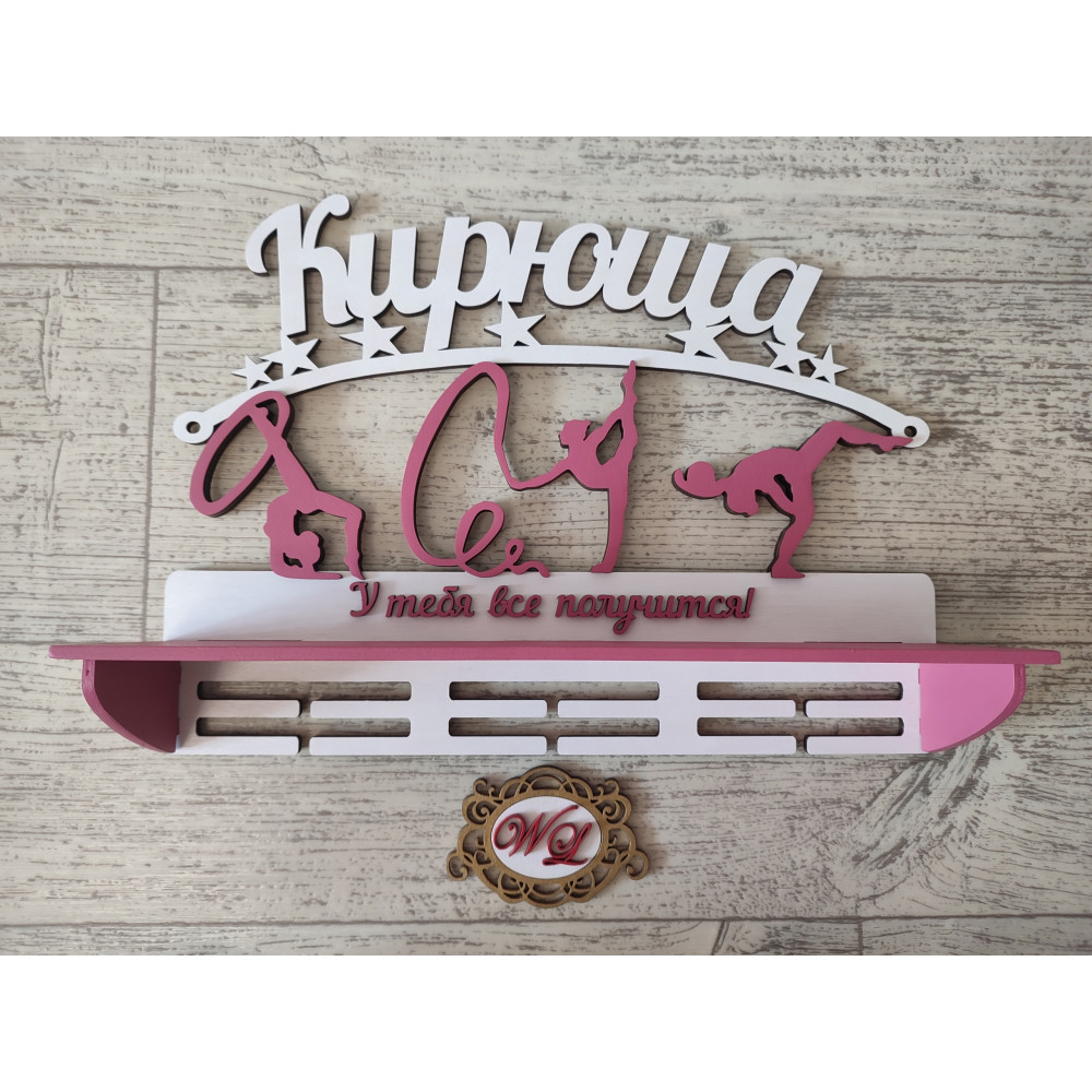 Медальница с тремя гимнастками, полкой, именем сверху и надписью "У тебя все получится" на основании.