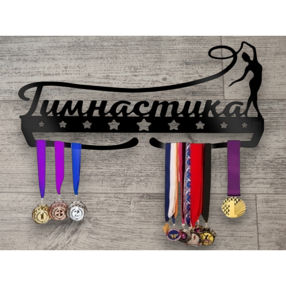Сверху слово "Гимнастика" и фигурка гимнастки, в основании вырезаны звезды, а снизу волнистые палочки для медалей.