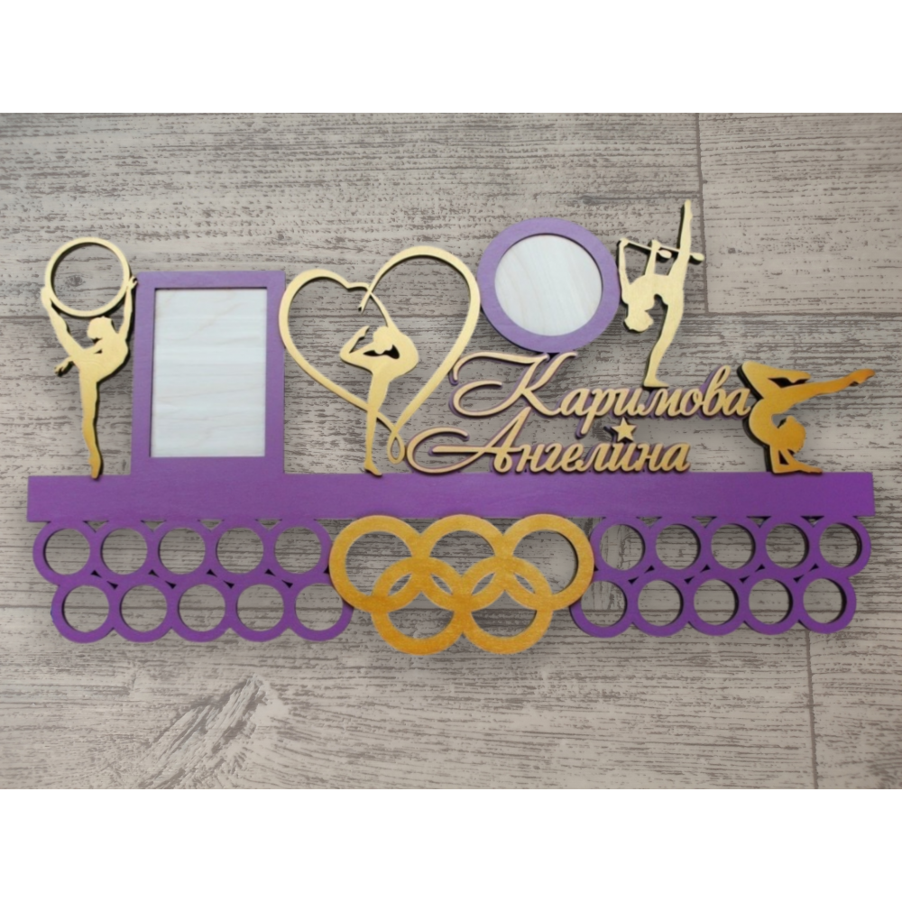 Медальница имеет 4 фигурки гимнасток, фоторамку 10х15см, фоторамку круглую 10х10см, фамилии с именем и вешалки для медалей в форме колец. Покрашена в золотой и фиолетовый цвета.