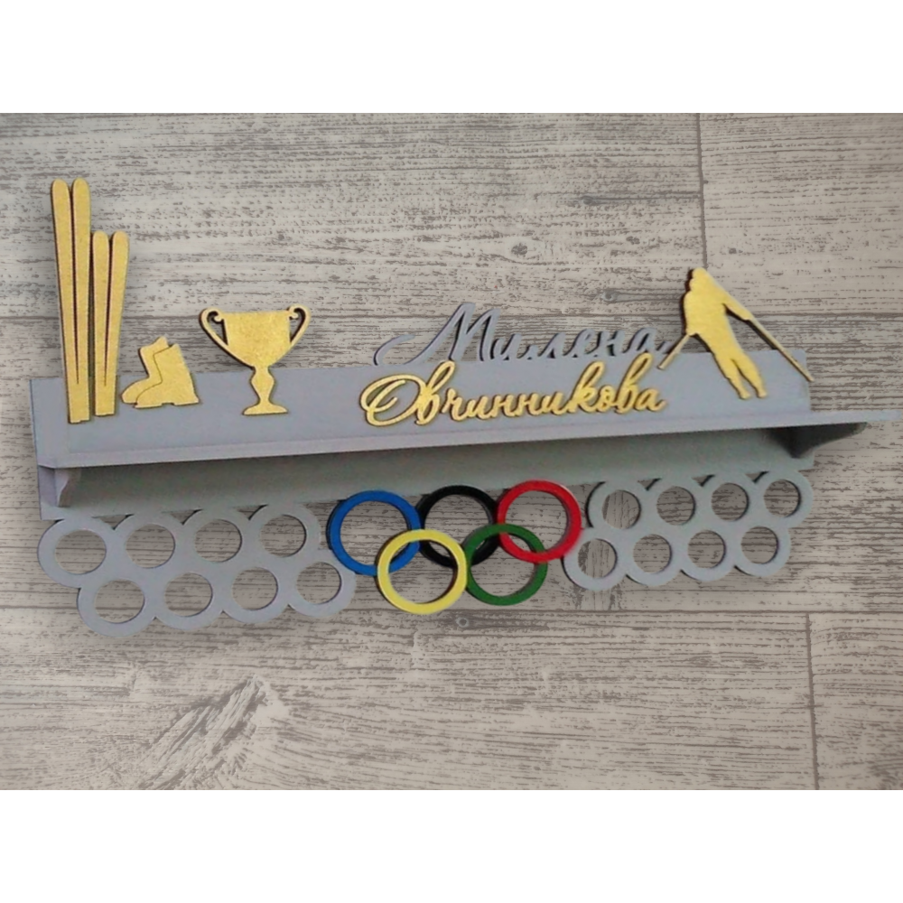 Медальница состоит из фигурки лыжника, фамилии с именем, кубка, изображения лыж с ботинками, олимпийских разноцветных колец, полки для кубка и колец для медалей.