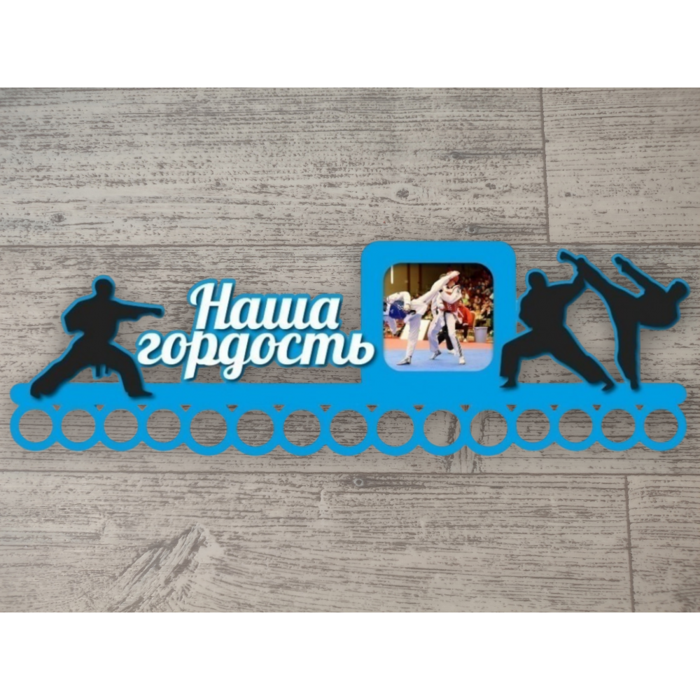 Медальница состоит из фигурок бойцов по краям, а по центру надпись "Наша гордость" и фоторамка 10х10см. Вешалки для медалей в форме колец в 1 ряд. Покрашена в голубой, белый и черный цвета.