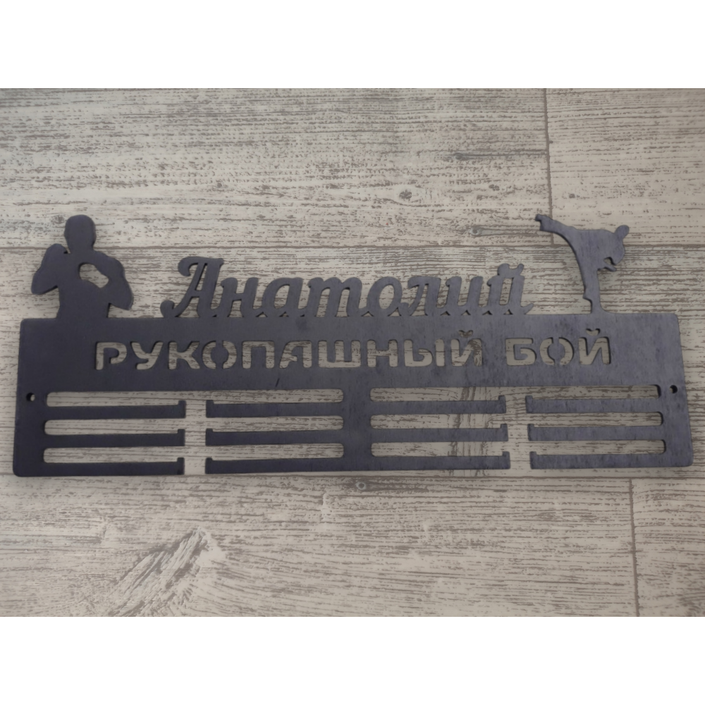 Медальница состоит из имени, двух фигурок, вырезанной надписи "Рукопашный бой" и вешалок для медалей.
