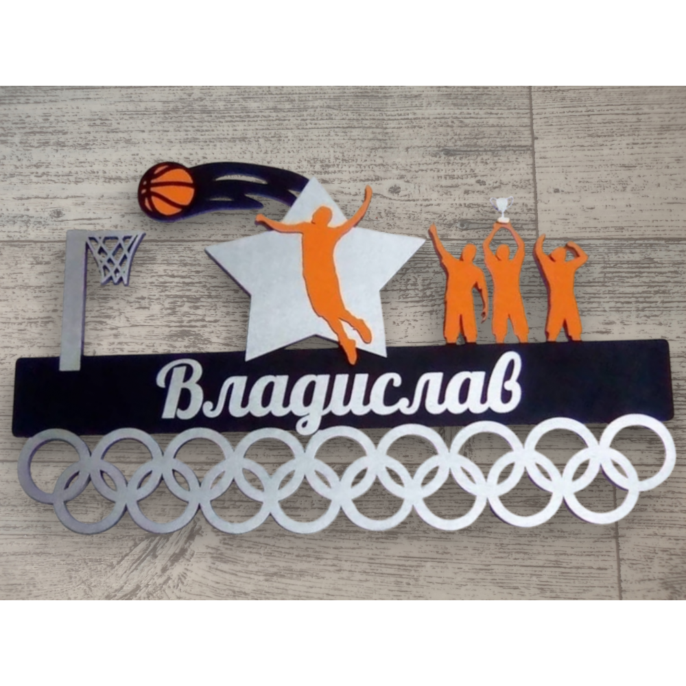 Сверху медальницы расположена баскетбольная композиция, на основании - имя, а снизу кольца для медалей.