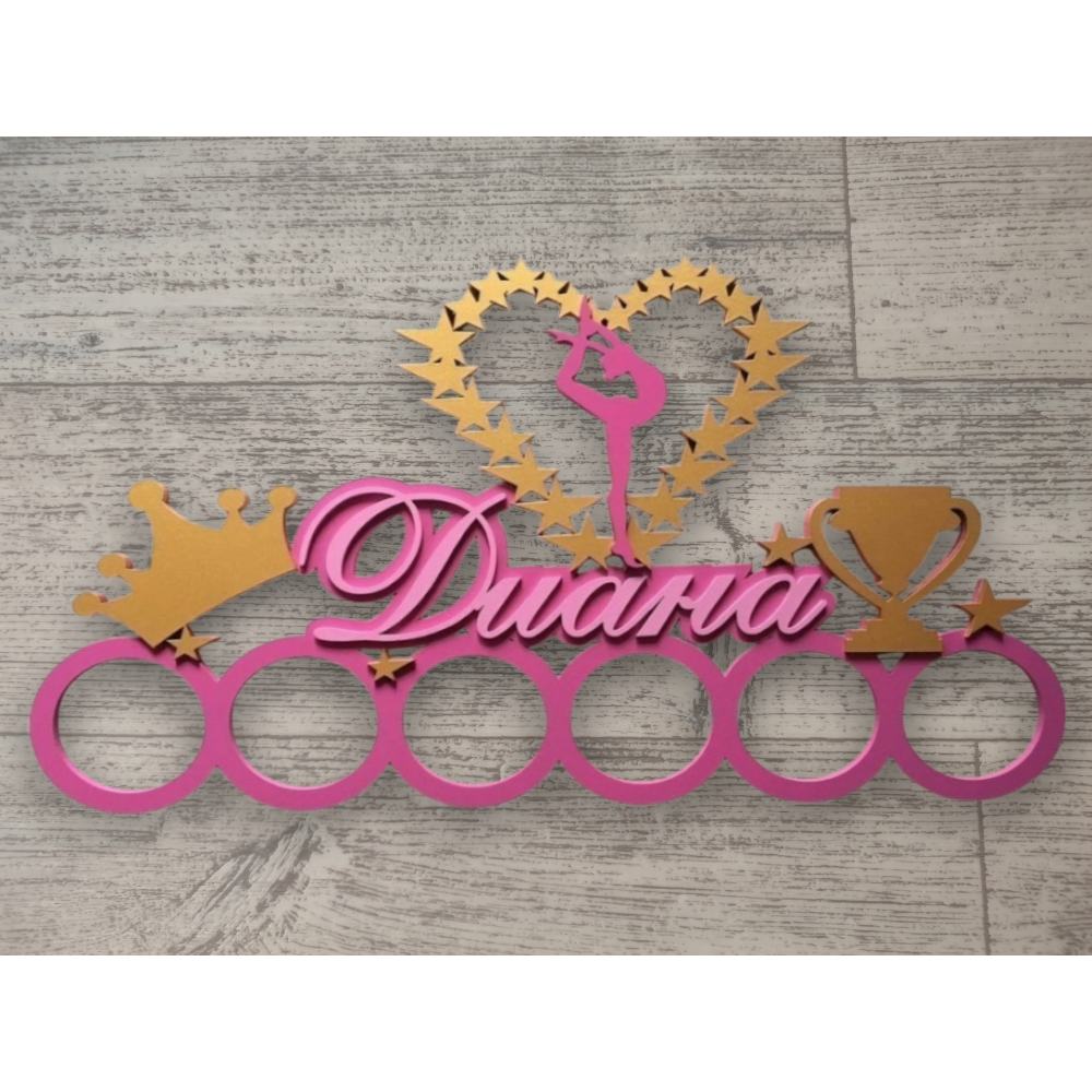 Сверху медальницы расположена фигурка гимнастки, внутри сердца, которое сделано из звезд. Под ними расположено имя, по краям которого корона и кубок. снизу вешалки для медалей.