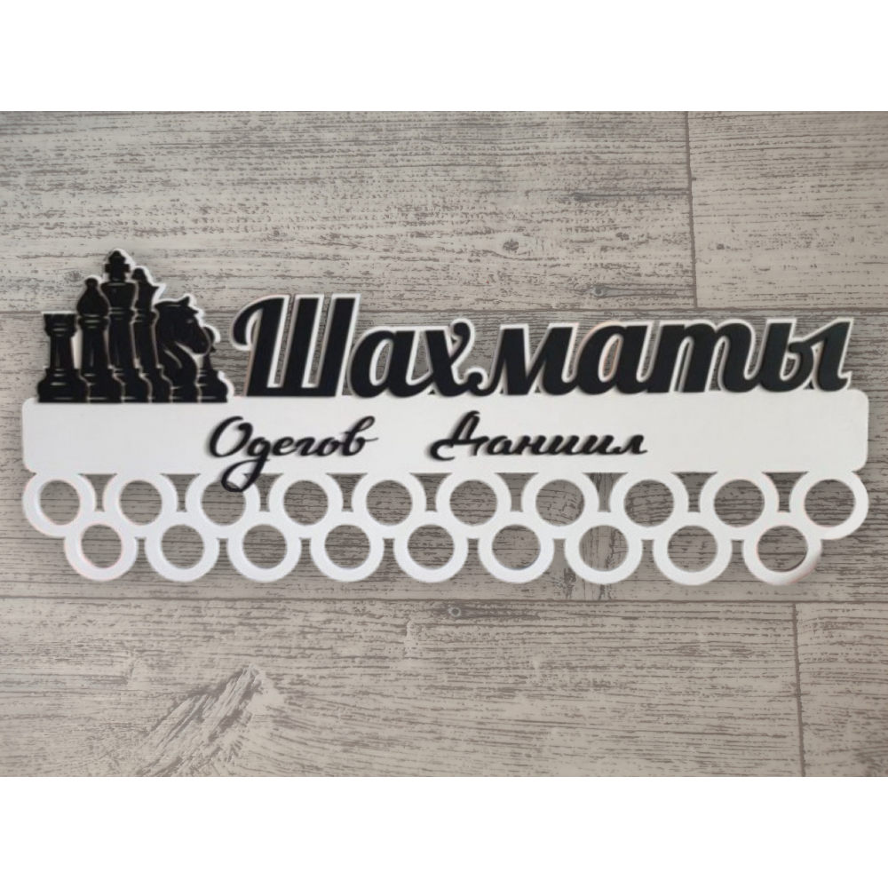Шахматные фигурки, слово "Шахматы" и фамилия с именем покрашены в черный цвет, а все остальное в белый.