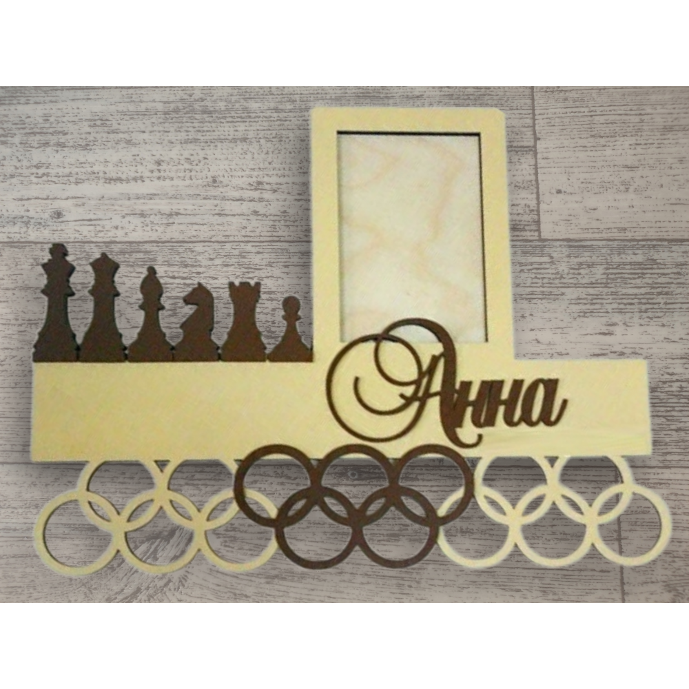 Именная медальница из фанеры имеет шахматные фигуры сверху сбоку, накладное имя, кольца для медалей и фоторамку.