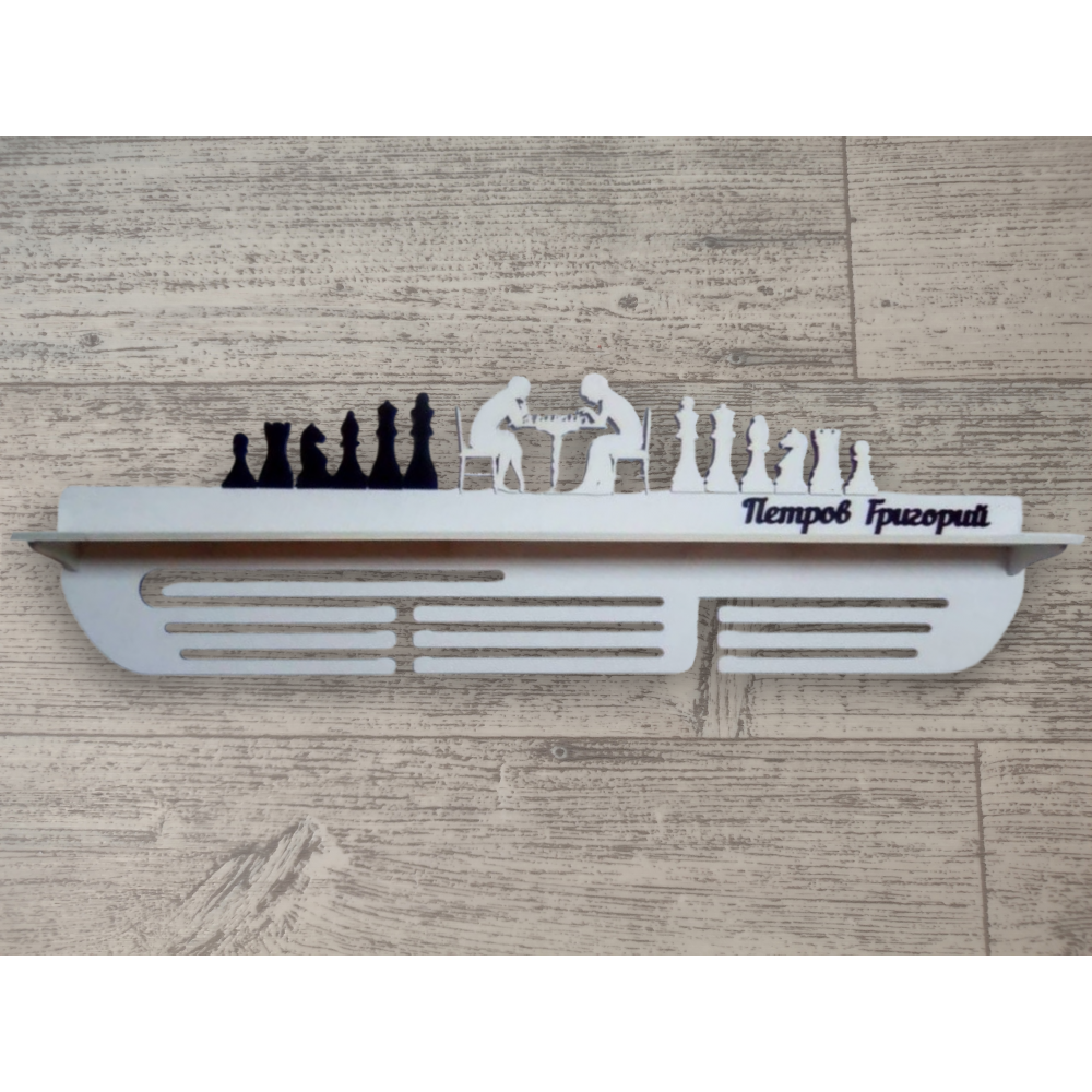 Медальница имеет композицию людей играющих в шахматы, шахматные фигурки, фамилия с именем, полку для кубков и вешалки для медалей.