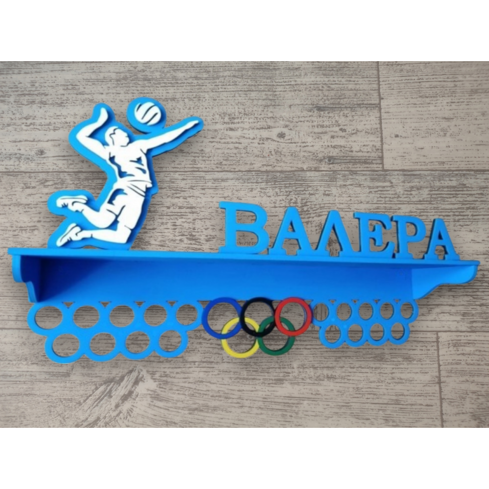 Медальница имеет фигурку прыгающего волейболиста с мячом в контуре, имя, полку для кубков, кольца для медалей и олимпийские кольца.
