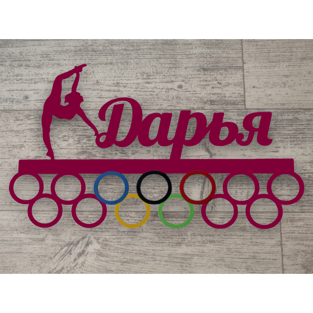 Медальница имеет фигурку и имя. Держатели для медалей в виде колец, по середине которых олимпийские.