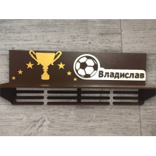 На корпусе медальницы, над полкой наклеены кубок со звездочками и имя с футбольным мячом. ..