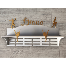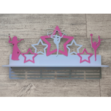 По краям медальницы расположена вертикальные фоторамки 10х15см, а по центру фигурка гимнастки с узорами...