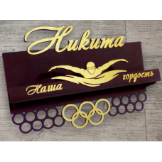 Сверху медальницы написано имя, а спереди на полке надпись "Наша гордость" и фигурка пловца...