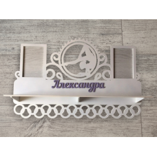 Медальница покрашена в белый и голубой цвет и имеет имя, фигурку, фоторамку, полку и накладные на основание на..