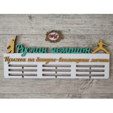 Медальница имеет надпись "Прыжки на батуте - воплощение мечты" на корпусе, фигурки и надпись с именем сверху и..
