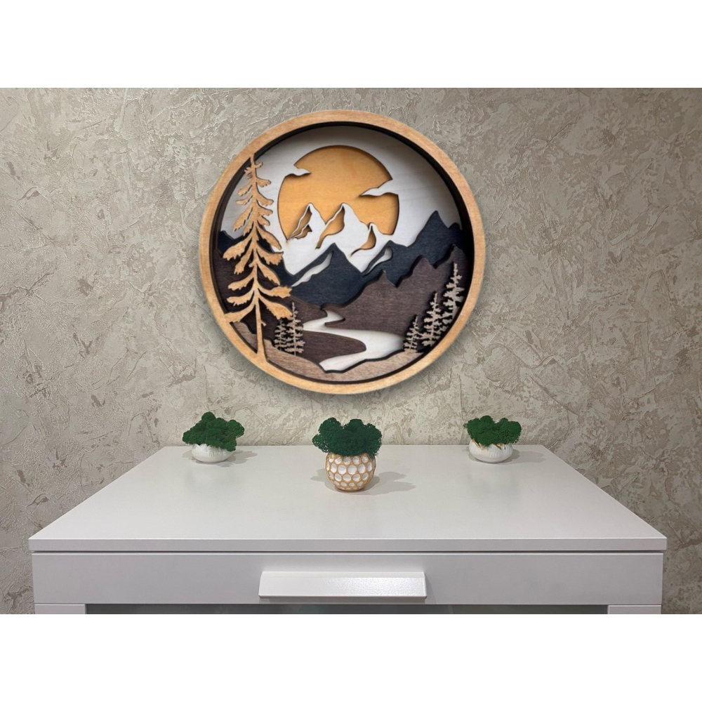 Многослойное панно из фанеры с изображением дороги в горах состоящее из 6 слоев круглой формы.