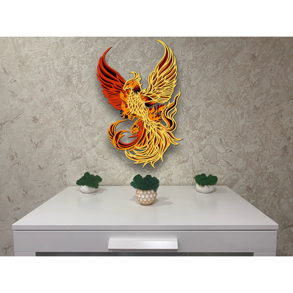 Многослойное панно с изображением феникса состоящее из 5 слоев фанеры.