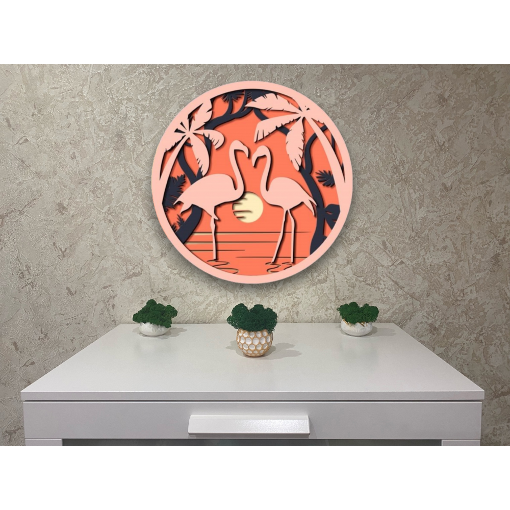 Многослойное панно из фанеры с изображением фламинго и пальм состоящее из 4 слоев.