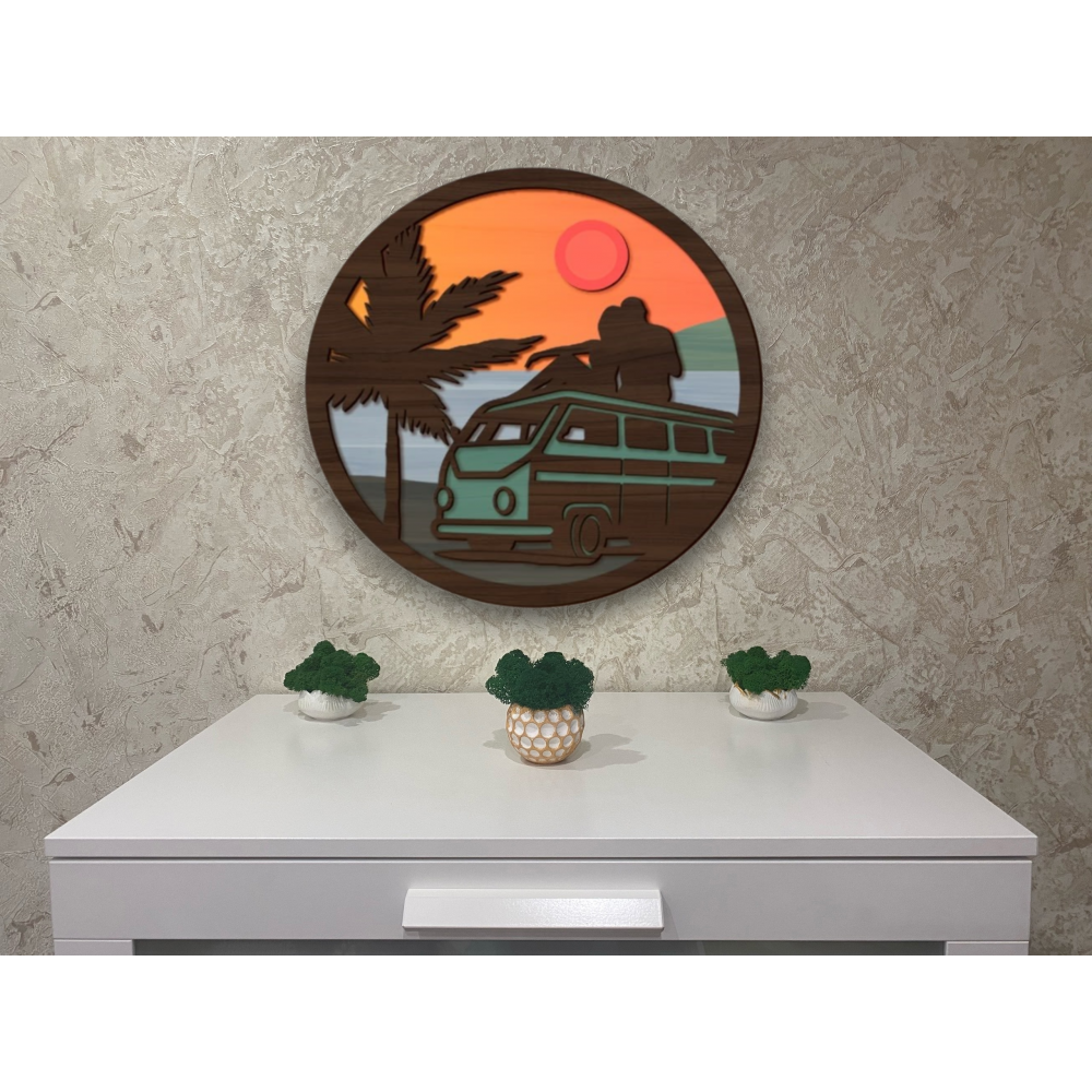 Многослойное панно из фанеры с изображением пары на автобусе, смотрящей на заказ состоящее из 5 слоев.