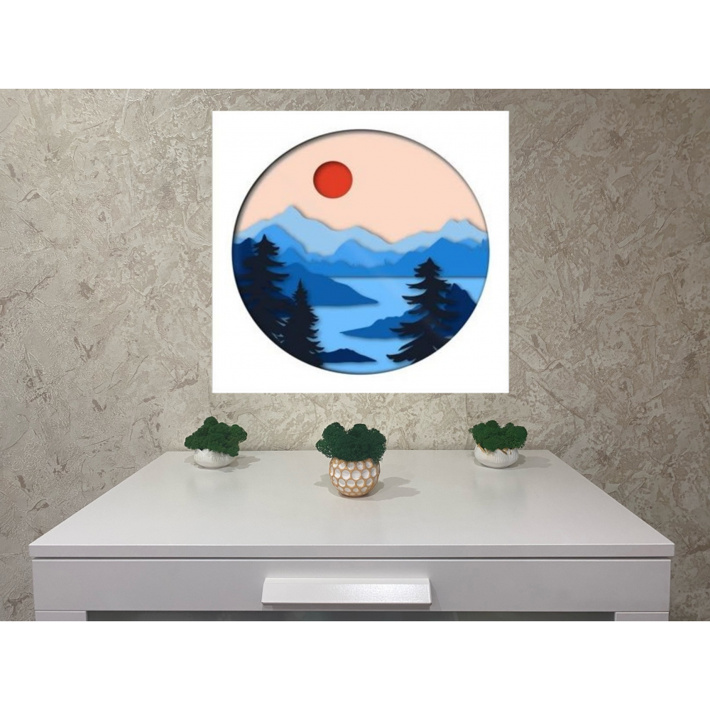 Многослойное панно из фанеры с изображением реки и гор состоящее из 9 слоев.