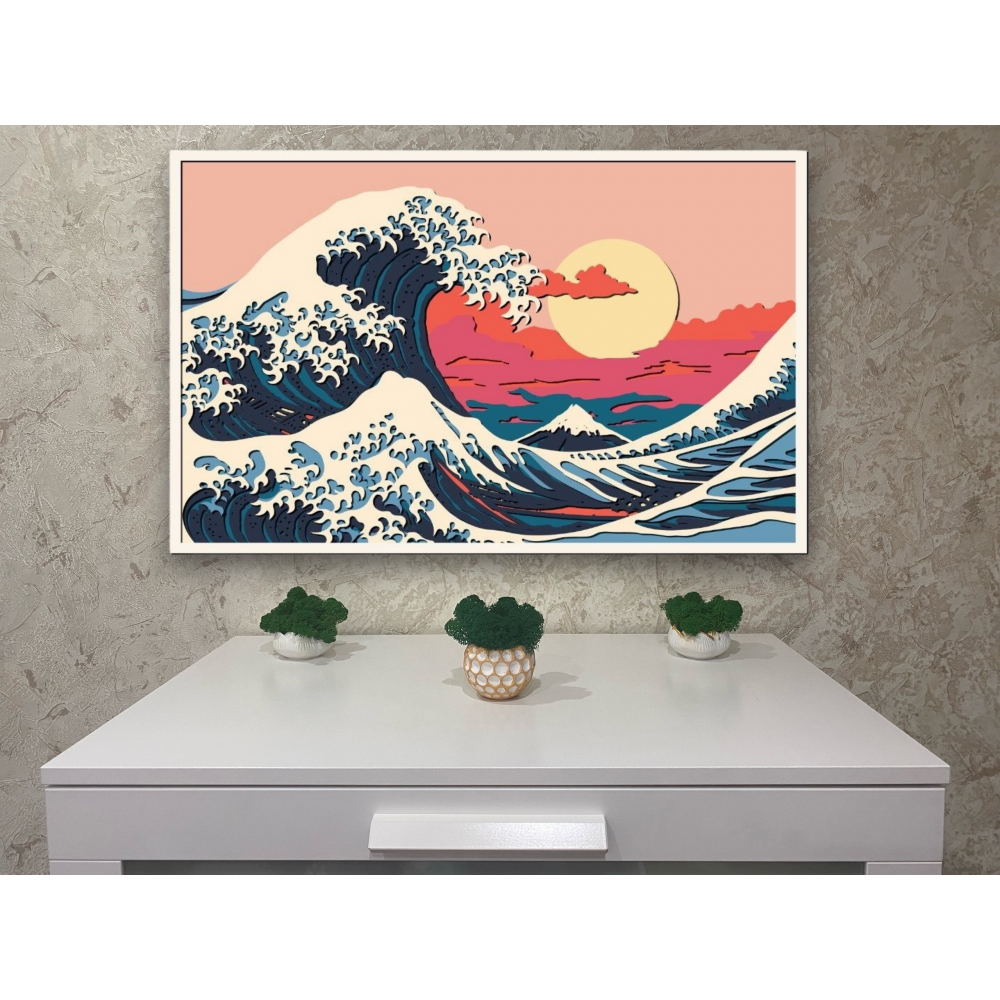 Многослойная картина с изображением волн на закате состоящая из 8 слоев фанеры.